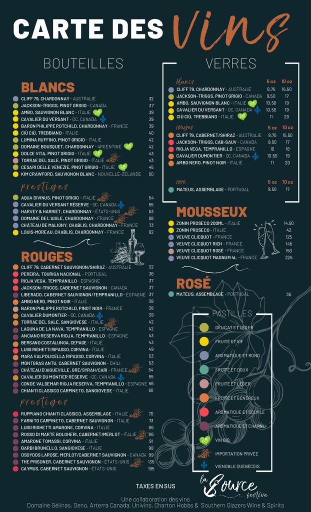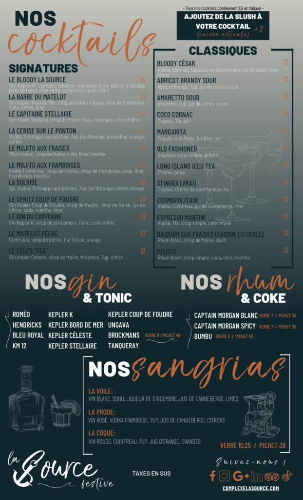 Dégustez l’une des nouveautés de notre menu ! Accompagnez votre repas d’une bière de micro-brasserie ou de notre grande sélection de vins, cocktails et spiritueux. La Source Gourmande saura vous charmer avec son incontournable terrasse sur le bord de l’eau avec sa vue à couper le souffle.